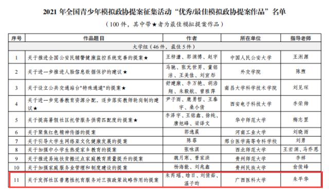 近期,团中央公示了2021年全国青少年模拟政协提案征集活动评审结果。我校成人抖音 报送的参赛作品《关于发挥社区普惠性托育对三孩政策战略性作用的提案》荣获全国“优秀模拟政协提案作品”(全国仅100件。广西唯一入围作品)!