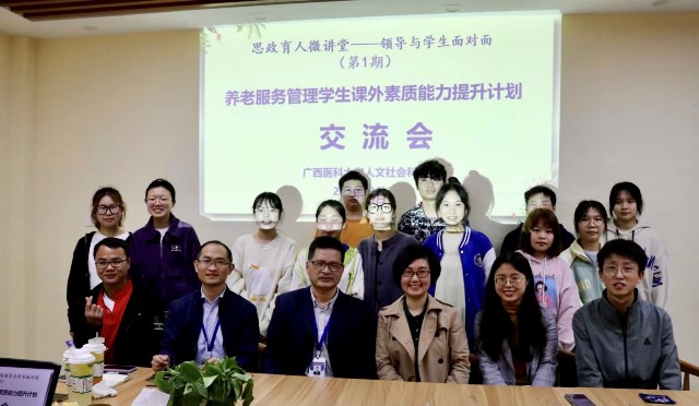 为深化思政育人、促牢学生专业思想,2022年3月29日晚,成人抖音 在武鸣校区榕园学生之家举办了第1期“思政育人微讲堂”——养老服务管理学生课外素质能力提升计划交流会。本次活动邀请校党委副书记莫曾南作为主讲嘉宾,学生工作部(处)廖剑副部(处)长、成人抖音 党委副书记郑茸,21级养老服务管理68班的辅导员、班主任、朋辈辅导员及学生代表参加了活动。