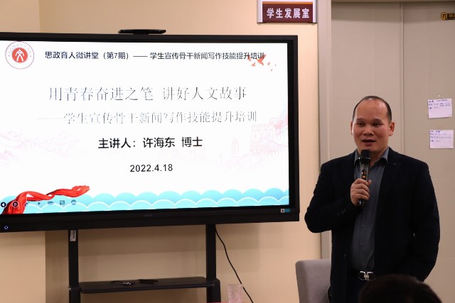 为提升学生写作技能,提高学院宣传思想工作的质量和水平,我院于4月18日晚在榕园学生之家召开了“用青春奋进之笔,讲好人文故事”学生宣传骨干新闻写作技能提升培训,活动由校党委宣传部副部长许海东主讲、辅导员吴清泉及学院学生宣传骨干参与活动。