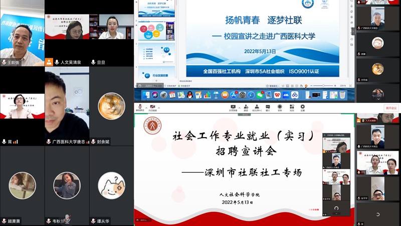 5月13日上午,我院链接深圳社联社工服务中心召开就业(实习)线上招聘宣讲会。我院党委书记唐忠、院长王前强、党委副书记郑茸、辅导员吴清泉以及大四毕业生及大三社工专业全体学生参与线上宣讲会。会上,深圳社联社工副总胡旦旦、优秀校友于泓双介绍了机构基本信息、人才招聘及培养情况等,针对学生提出的就业和实习的具体问题,结合机构的实际需求和情况进行了答疑解惑。
