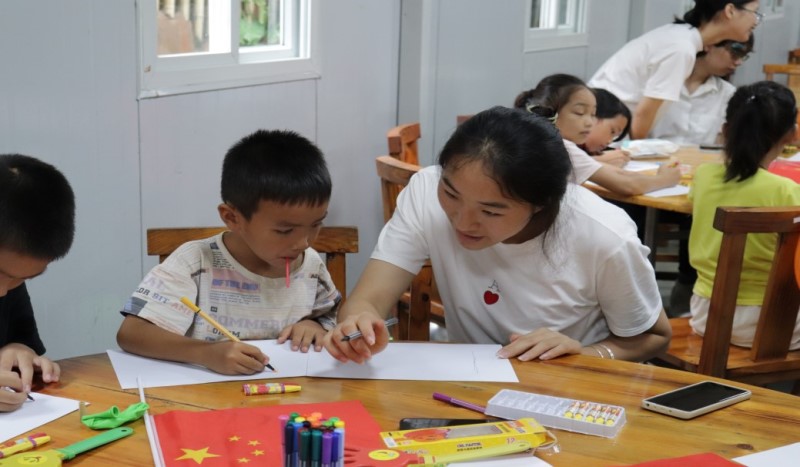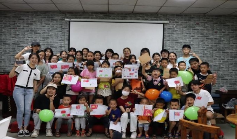 在7月6日上午的《我和我的祖国》主题活动中,大学生志愿者先是和小朋友们唱响红歌,引导小朋友们在自己绘画的国旗下自己畅想美好未来。而后陪伴小朋友们观看《觉醒年代》中关于社会主义来历与中国共产党成立的重要片段,讲述党史故事,在小朋友们的心中播下了为自身理想和中华民族伟大复兴中国梦而奋斗的火种。