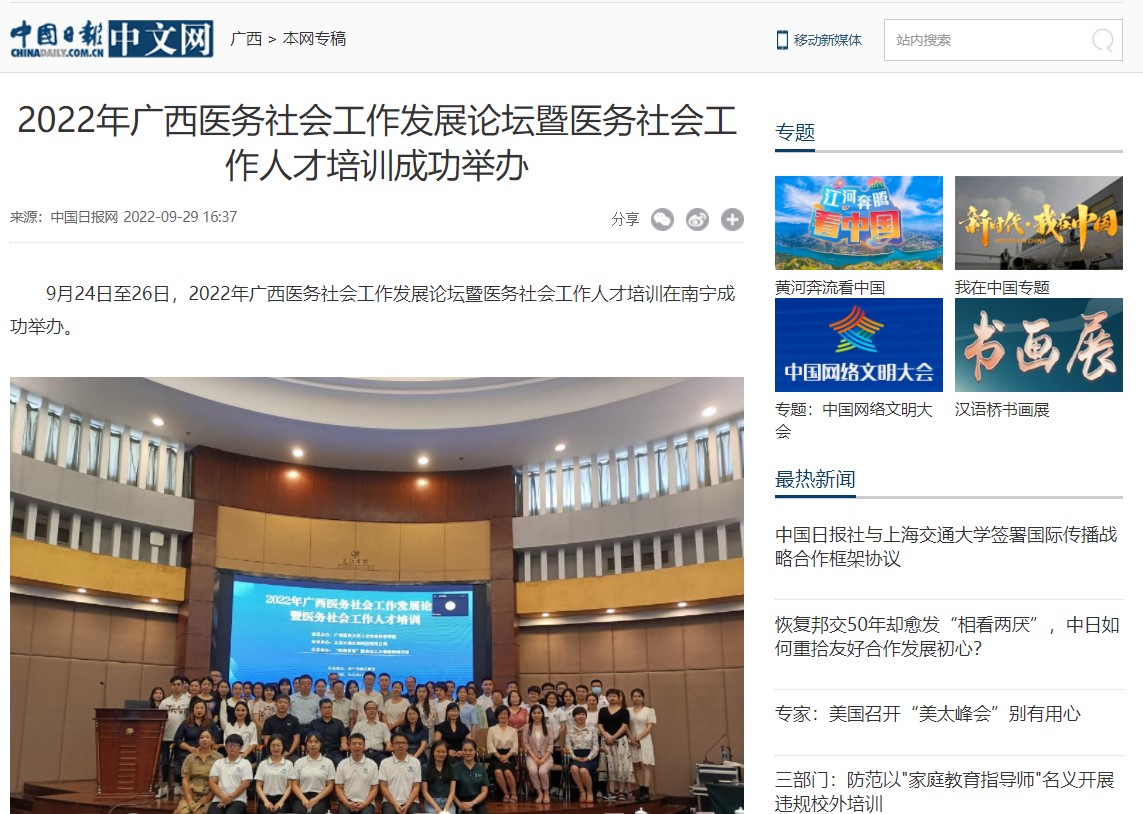 2022年9月29日,人民网、中国日报网、中国网等多家媒体报道由我校成人抖音 主办的2022年广西医务社会工作发展论坛暨医务社会工作人才培训。
