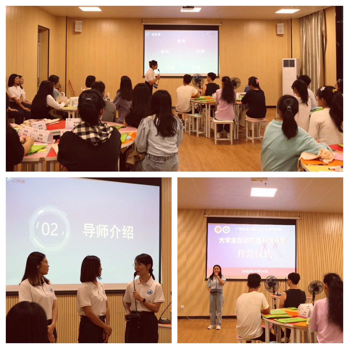 2022年10月14日,我院大学生自信心提升训练营正式开营。学院党委副书记郑茸老师,辅导员黄文瑛老师、唐澜老师、吴清泉老师,广西生涯俱乐部巫妮燕、简敏华、钟春玲、马昭敏、徐芳5名校外导师,学院李琳珠、陈昱臻、甘露、翟跃、蒋映月5位朋辈助教和37名营员参加开营仪式。