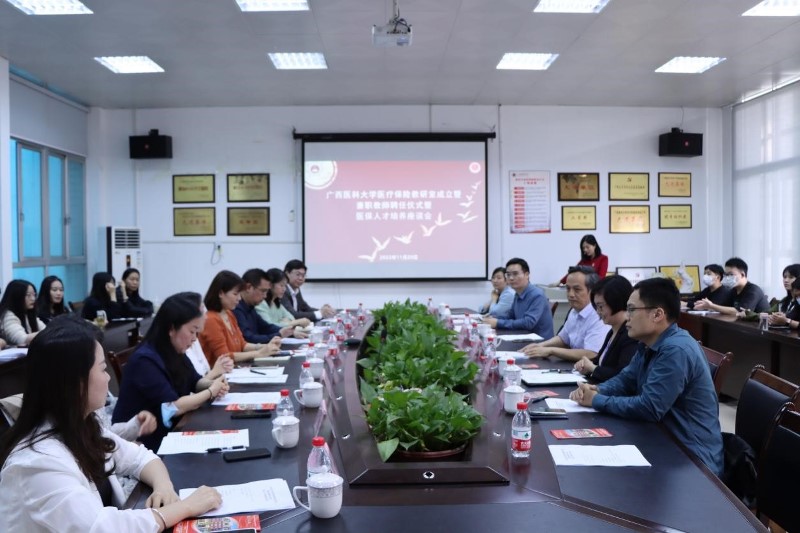 为强化医疗保险专业人才培养,加强教师梯队建设,提升教学科研水平,培养“懂医学、会保险、能管理”的医保专业技术人才,2022年11月21日下午,成人抖音 医疗保险教研室成立暨兼职教师聘任仪式暨医保人才培养座谈会在成人抖音 206会议室举行。成人抖音 第一附属医院医保办公室梁冰主任、第二附属医院医保科金卉科长、第二附属医院病案信息科吴韫红主任、附属肿瘤医院医保保健科张宇科长、附属肿瘤医院病案信息科肖晓兰副主任、南宁市第一人民医院医保科吕艳红科长、南宁第二人民医院医保科尚晓斌科长,人文社会科学学王前强院长、郑茸副书记、陈宇副院长,医疗保险教研室朱平华主任、于杰副主任,以及教研室的老师们和社会保障专业的研究生们参加会议。会议由陈宇副院长主持。