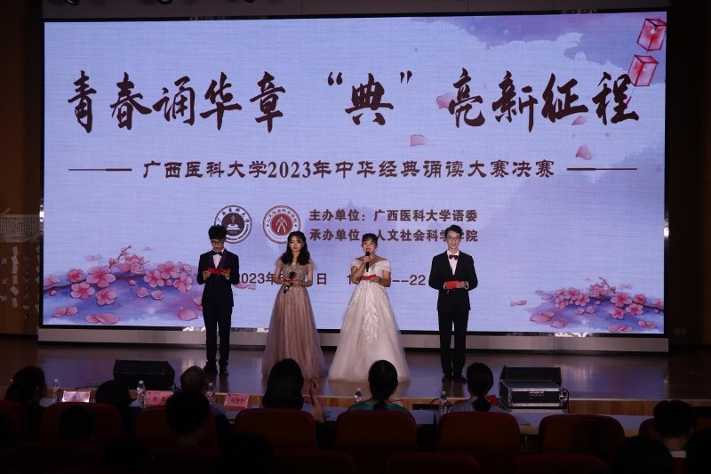 2023年6月11日晚,“青春诵华章 ‘典’亮新征程”成人抖音 2023年中华经典诵读大赛决赛在武鸣校区图书馆报告厅举行。我校教务处刘登宇处长、成人抖音 党委郑茸副书记、药学院党委林晓副书记及各学院指导老师出席本次比赛。大赛邀请广西广播电视台主持人青梅老师、我校普通话培训测试站副站长梁永红老师 、校团委梁冬玲老师作为大赛评委。